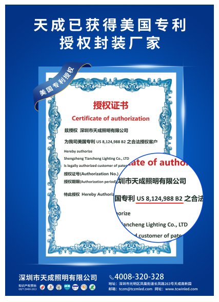 天成照明取得矽誠科技US8124988B2專利授權(quán)封裝廠家資格,引領(lǐng)綠色照明新時代 |