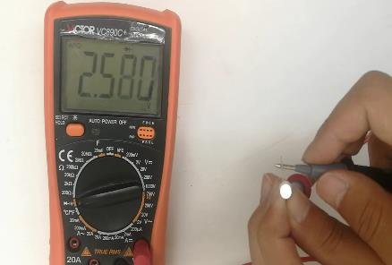 對(duì)于LED燈來說,發(fā)出不同顏色的光,壓降也有所不同,也就是正常工作電壓范圍會(huì)有所差別,如果自己要做的指示燈用到的LED燈,額定電壓是知道的那最好了,不知道也沒關(guān)系,用萬用表上的二極管檔可以把這個(gè)參數(shù)測(cè)量出來,例如下圖這個(gè)發(fā)白光的LED燈,顯示的壓降為2.58 V,這里我們就取LED燈的正常工作電壓(記為U)為2.5 V LED燈的正常工作電流用萬用表不能直接測(cè)量出來,一般像這種LED燈的正常工作電流在17 m A(一般情況下購買LED燈的時(shí)候會(huì)給出LED燈的額定功率和額定電壓,用功率去除上電壓就是LED燈的額定電流)左右,這里我們認(rèn)為電流在15-20 m A(記為I 1-I 2)之間, LED燈都能正常工作。